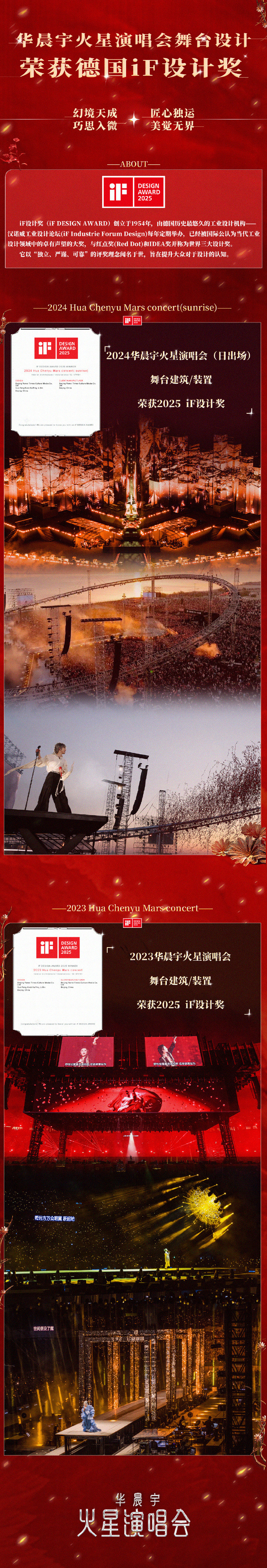 喜讯如春风拂面,火星演唱会荣耀加冕!在2025iF设计奖的璀璨舞台上,华晨宇火星演唱会连续两年荣耀登榜,双冠闪耀,美学巅峰再添辉煌!